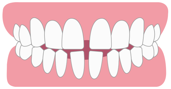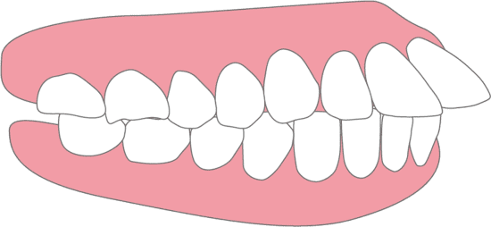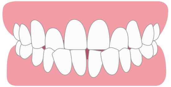 歯が凸凹しており、歯が生えるスペースが足りない、顎に対して歯が大きい場合になりやすい歯並びです。